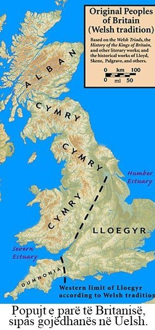 Një legjendë (përrallë e ndërtuar me ca nga tullat të vërteta) e botuar në shekullin XII në rrëfenjën “Historia Regum Britanniae” (Historia e Mbretërve të Britanisë) nga Geoffrey of Monmouth tregon se luftëtari Brutus bashkë me trojanët e tij arriti në Albion, ku jetonin gjigandë. Pasi Bruti e mundi gjigandin Goëmagot/Gogmagot (Gjëmadhin/Gegmadhin), dhe nisur nga emri i vetes ai e quajti atë vend Britani dhe ardhacakët e tij Britonë. Në një rrëfenjë tjetër, Geoffrey of Monmouth tregon për udhëheqësin nga Uellsi Conan Meriadoc, Prince d’Albanie, i cili themeloi në shekullin IV mbretërinë Bretagne/Britanny, që sot është gadishull në Francën perëndimore.