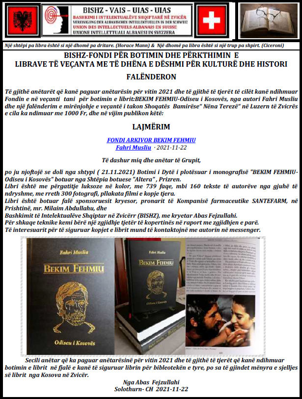 po ju njoftojë se doli nga shtypi ( 21.11.2021) Botimi i Dytë i plotësuar i monografisë “BEKIM FEHMIU-Odiseu i Kosovës” botuar nga Shtëpia botuese “Altera”, Prizren.