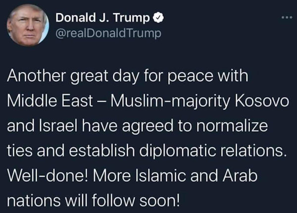 Më 4 shtator në Shtëpinë e Bardhë, Kosova dhe Serbia nënshkruan dakordimin për normalizimin ekonomik ndërmjet tyre në praninë e ish presidentit amerikan Donald J. Trump. Pjesë e dakordimit ishte edhe pajtim i Izraelit për njohjen e Kosovës dhe vendosjen e marrëdhënieve diplomatike.