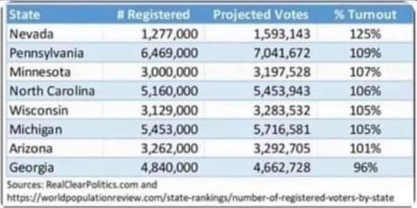 Kështu, numri i regjistrimit të votuesve i kalonte mbi 100% të votuesve legjitimë. Studimi përfshin 8 shtete, me mbi 100% të votuesve: Alaska, Colorado, Maine, Maryland, Michigan, New Jersey, Rhode Island dhe Vermont.
